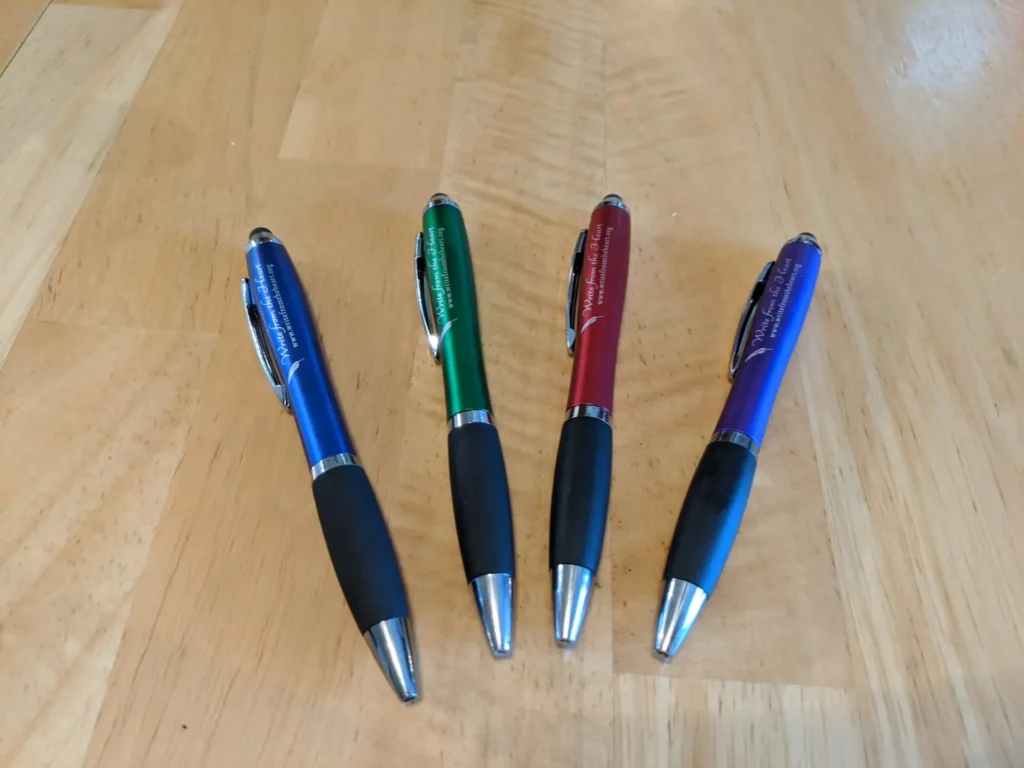 These Write from the Heart pens are black ballpoint and include a soft stylus on the end. Twist on/off. Comes in four assorted colors.